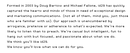 id29 design + marketing :: 39 First Street :: Troy, NY 12180 :: ph 518.687.0268 :: fx 518.687.0607 :: Formed in late 2003 by Doug Bartow and Michael Fallone, id29 has quickly captured the hearts and minds of those in need of exceptional design and marketing communications (not all of them, mind you, just those who are familiar with us). Our approach is unencumbered by arrogance, pretense or adherence to what's expected. We're more likely to listen than to preach. We're casual but intelligent, fun to hang out with but focused, and passionate about what we do. We think you'll like id29. We know you'll love what we can do for you.